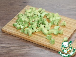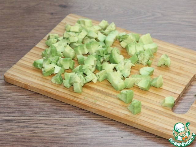 8. И нарезаем маленьким кубиком. Можно сбрызнуть нарезку авокадо лимонным соком. Продукты готовы, можно приступать к формовке салата.