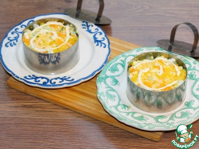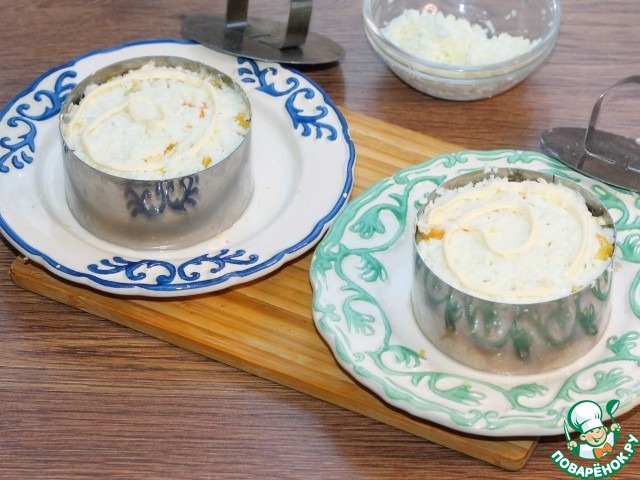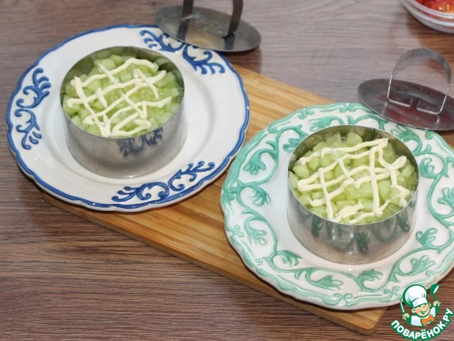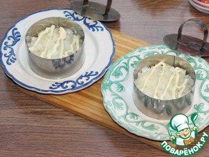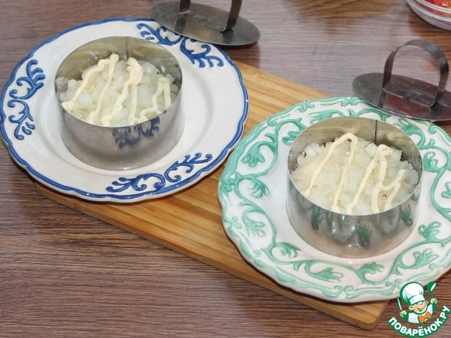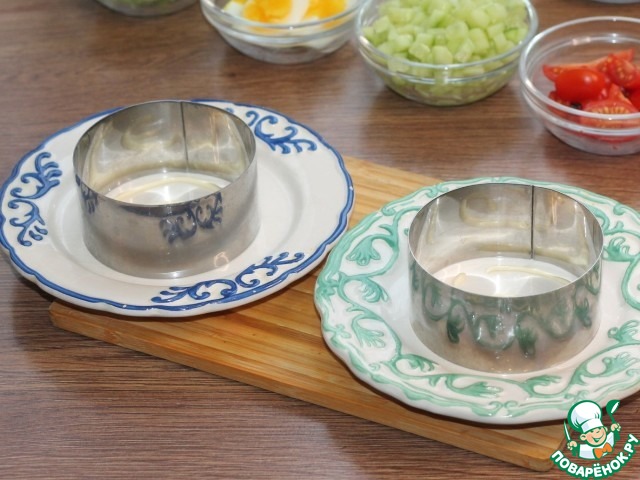 9. Берем 2 блюда и смазываем дно майонезом. Устанавливаем на блюдо формовочные кольца.