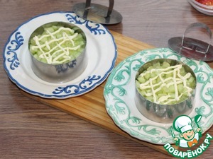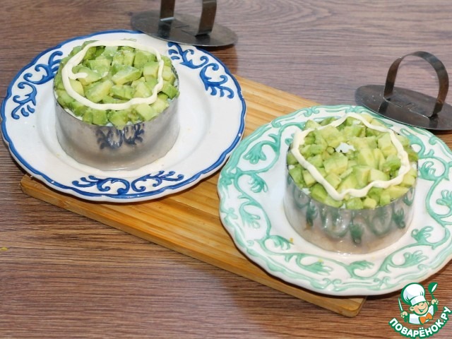 15. Последний слой – авокадо + немного майонеза по краю салата.