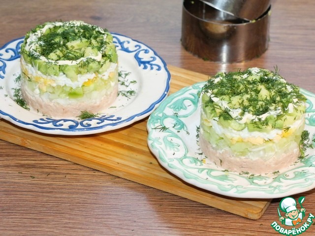 Этот салат готовится из обычных ингредиентов, но получается очень вкусным, легким и полезным. Сервировать его удобно с помощью кулинарного кольца. Тунец для такого салата можно взять в собственном соку или в масле. Если берете в собственном соку, то блюдо лучше заправить домашним майонезом или сметаной, или йогуртом. Если же вы предпочитаете тунец в масле, то салат можно не заправлять, он и так получится сочным.