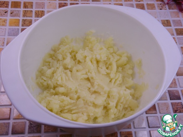 Заранее отваренный и охлажденный картофель выложить в миску и пюрировать толкушкой или блендером.