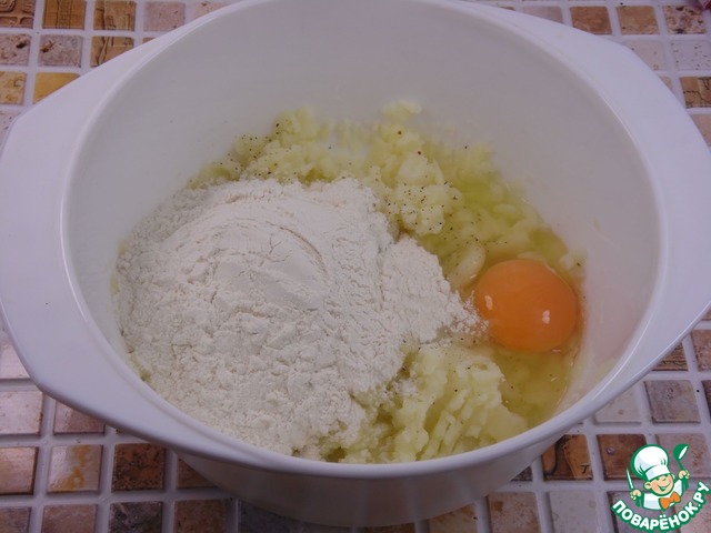 В полученное картофельное пюре добавить яйцо, соль, перец и муку с разрыхлителем. Замесить тесто.