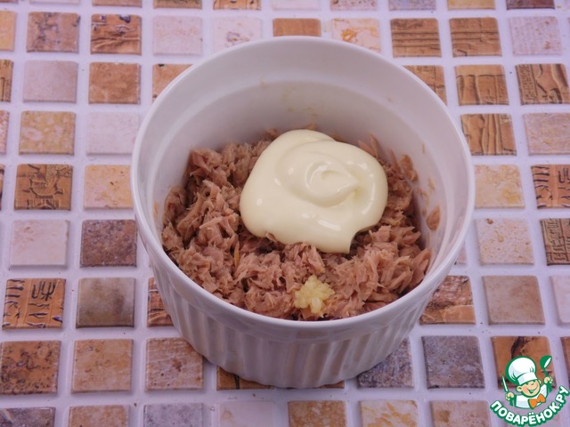 Для начинки размятый вилкой тунец смешать с измельченным чесноком и майонезом.