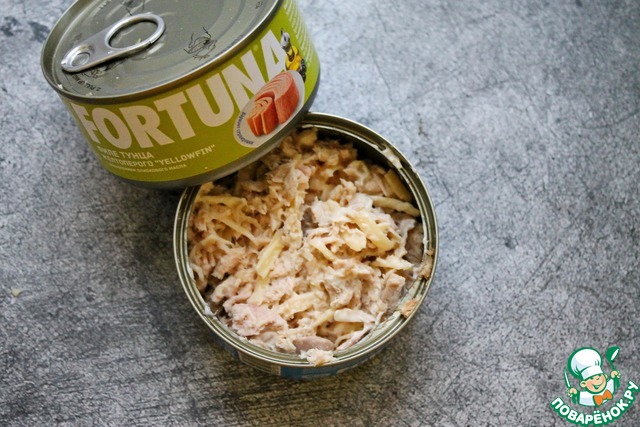 С тунца ТМ "FORTUNA" слейте масло и разомните вилкой. Добавьте к нему натертый на крупной или средней терке сыр, майонез и перемешайте.
