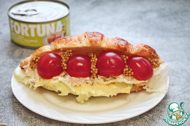 Круассаны разрежьте вдоль, не до конца, положите листья салата и уложите начинку из тунца с сыром.
