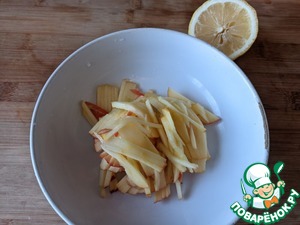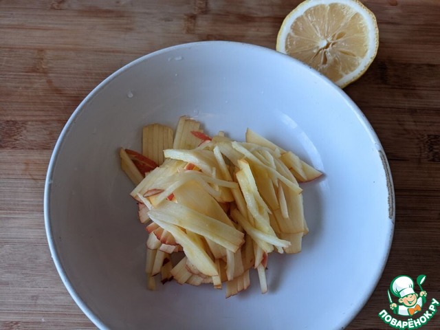 Яблоко режем тонкими полосками или трём на тёрке, сбрызгиваем соком лимона.