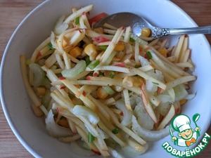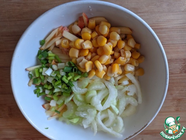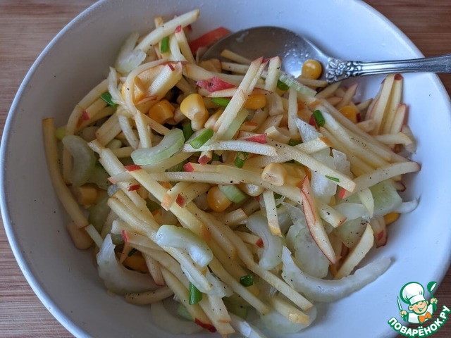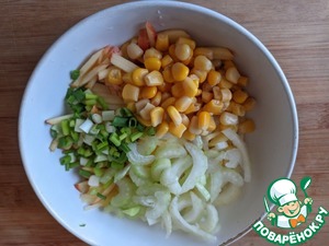 Добавляем к яблоку кукурузу, зелёный лук, порезанный колечками, сельдерей, порезанный полосками.