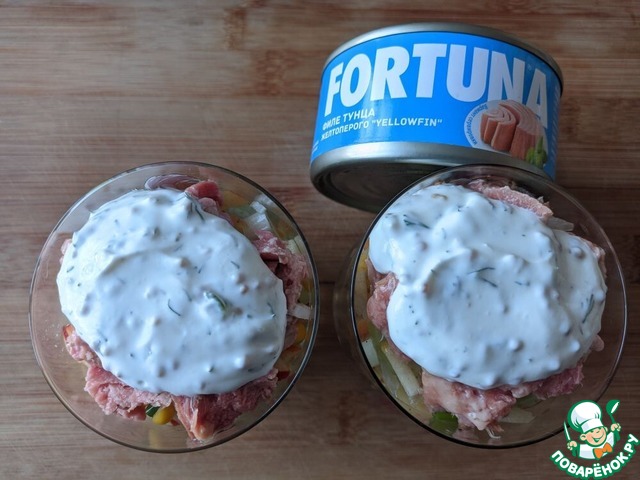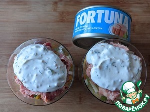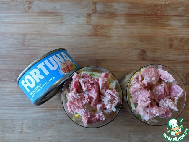 Сверху кладём размятый тунец. Из расчёта 1/4 банки на порцию. У меня тунец ТМ FORTUNA.