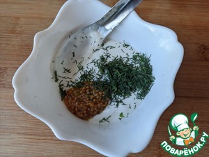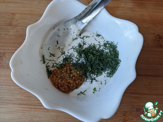 Готовим заправку. Смешиваем йогурт, горчицу и рубленный укроп.