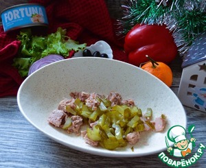 Тунец выложить в салатник, добавить порезанный огурец.