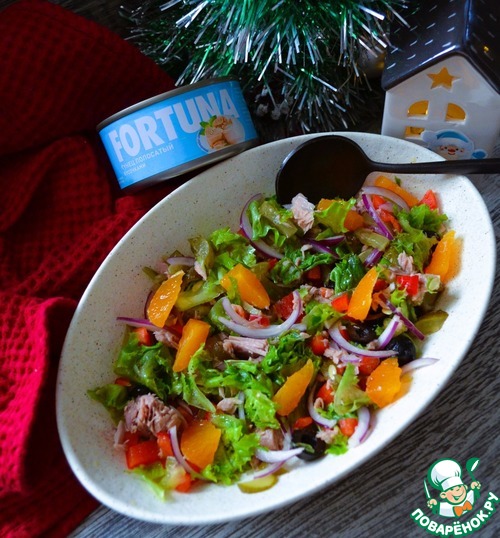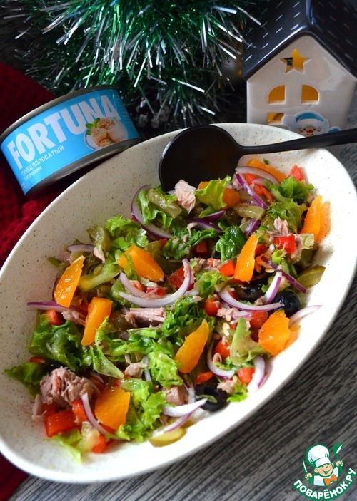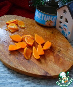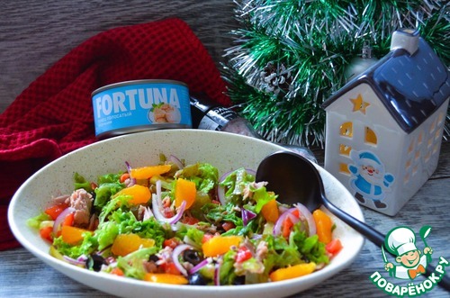 Настроение должно быть лёгким и весёлым, в предвкушении чудес и неожиднанных подарков, обязательно с ароматом мандаринов. Вот и салат такой - яркий, лёгкий, красивый и с мандаринами. Рекомендую.