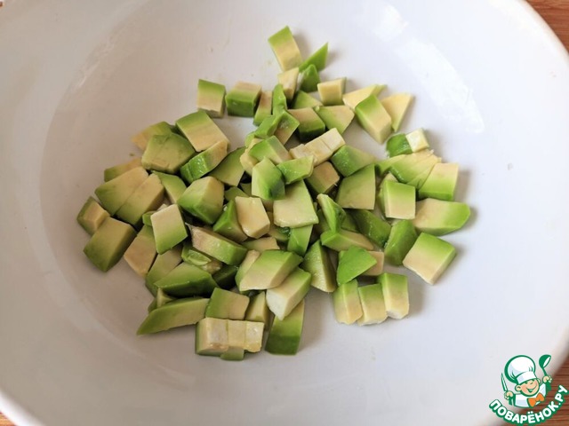 Авокадо чистим, режем кубиками, сбрызгиваем соком лимона.