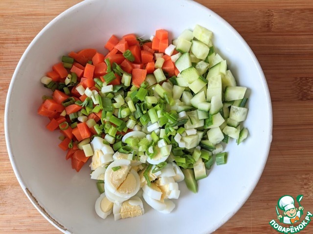 Морковь чистим, режем кубиками. Огурец также режем кубиками. Чистим перепелиные яйца, несколько оставляем для украшения, режем кубиками. Зелёный лук режем колечками.