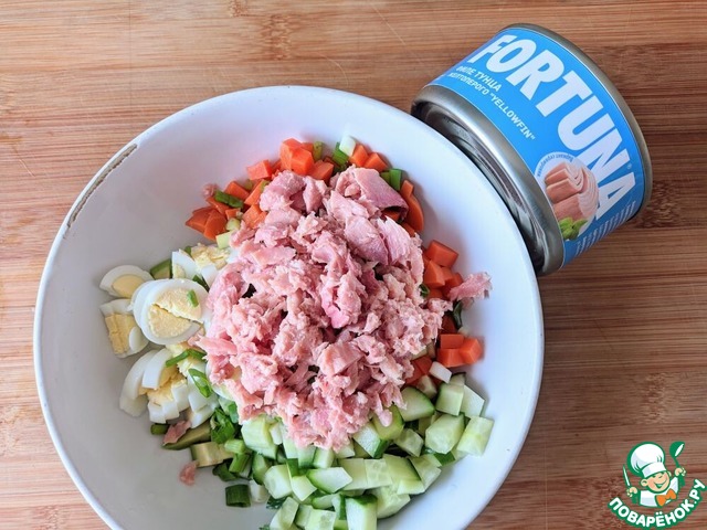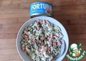Тунец разминаем вилкой, кладём в салат. У меня тунец ТМ FORTUNA.