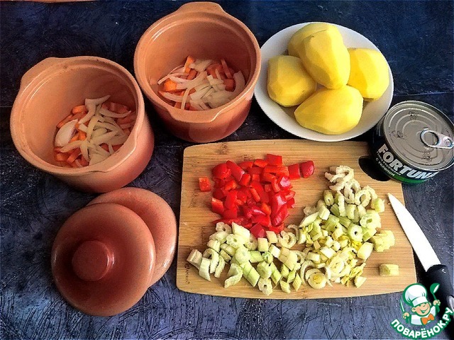 Готовим все продукты, которые нам понадобятся. Овощи нарезаем произвольно. Я резала не крупно. Нам понадобится 2 глиняных порционных горшочков.