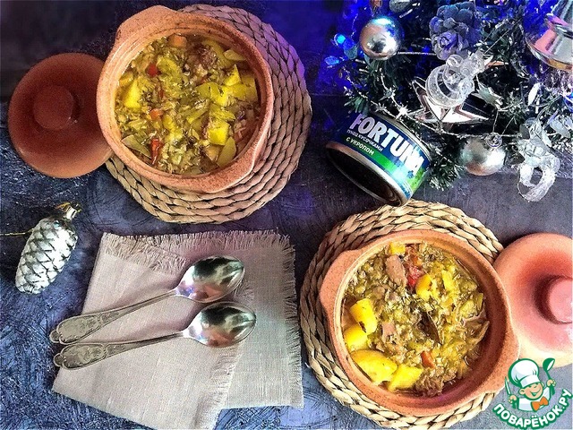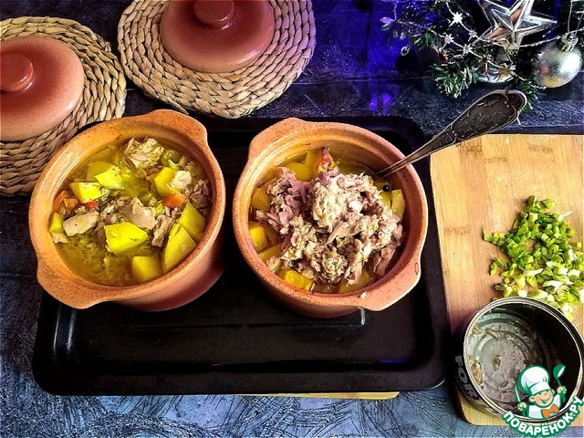 Жаркое в горшочке с тунцом в укропе. Это блюдо можно назвать и первым, и вторым - горячее. Подойдёт на новогодний стол в долгие зимние каникулы даже тем, кто соблюдает Рождественский Пост в дни, когда рыба разрешена. Блюдо и диетическое, подойдёт для определённой диеты. И конечно же оно подойдёт для всех! Это вкусно и полезно.