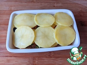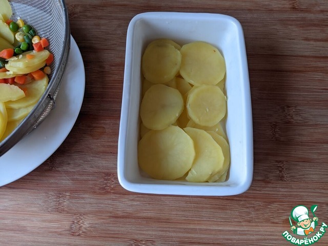 Картофель чистим, режем тонкими кружками, толщиной около 5 мм. Отвариваем до полуготовности около 10 минут в подсоленной воде.