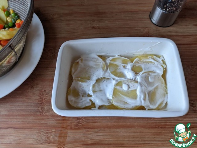 Смазываем картофель сметаной. Солим, перчим по вкусу.