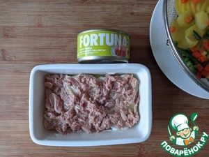 Кладём размятый тунец. В этом рецепте лучше брать тунец в масле. У меня - ТМ FORTUNA.