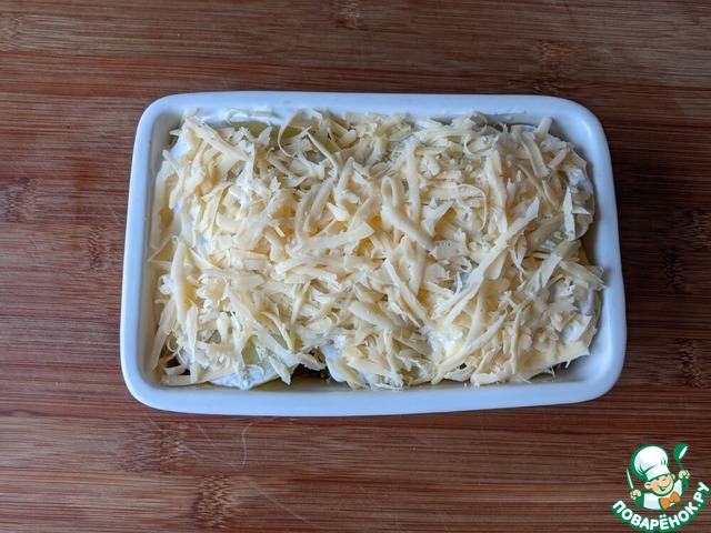 Смазываем картофель сметаной, посыпаем тёртым сыром. Ставим на 180 градусов в духовку на 30 минут.