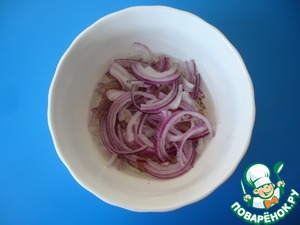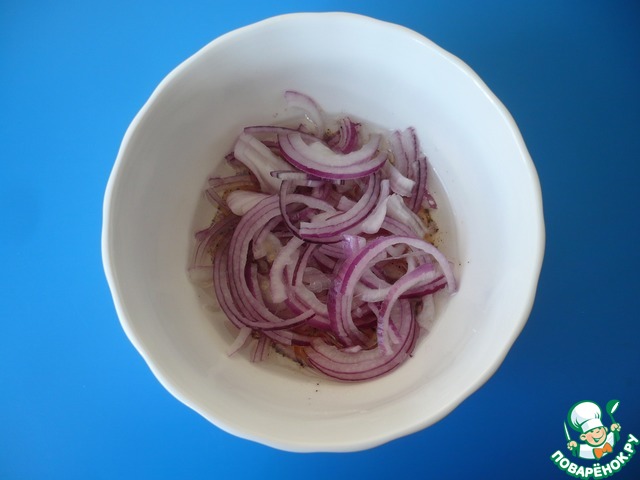 Красный лук нарежьте тонкими полукольцами и отправьте в приготовленную заправку. Оставьте немного промариноваться.