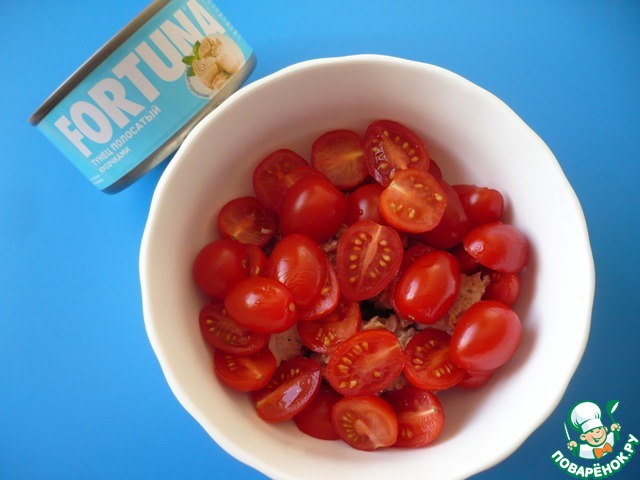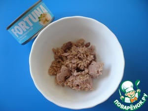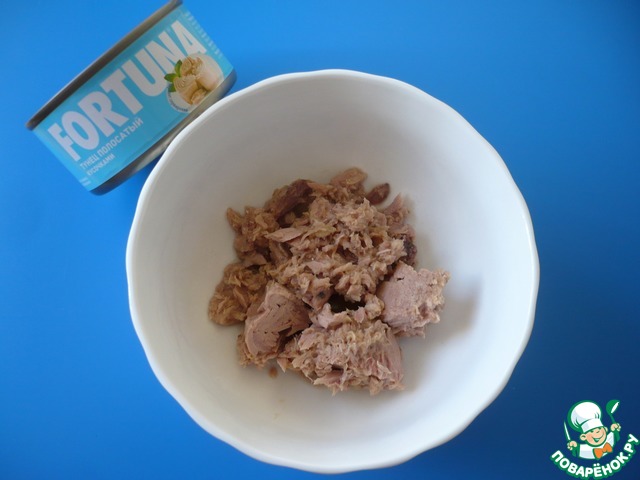 В другую миску выложите кусочки полосатого тунца ТМ FORTUNA.