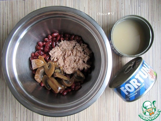 Соедините фасоль, грибы и филе тунца без жидкости. Измельчите с помощью погружного блендера.