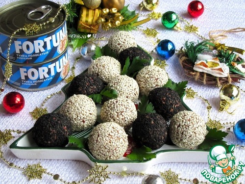 Нарядные закусочные шарики в кунжутной панировке из пикантного фасолево-орехового паштета с грибами и тунцом ТМ FORTUNA. Быстро, сытно и вкусно. Попробуйте!