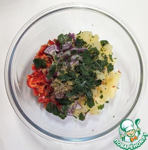 Нарезать очень мелко чили, можно и без него (но чили придаёт "изюминку" салату), нарезать мяту и поперчить.