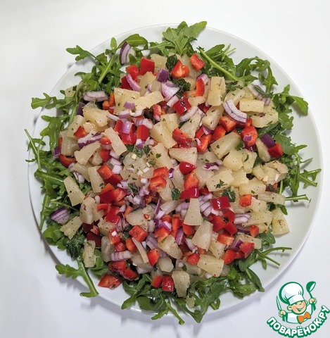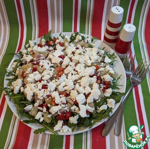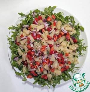 Я не солю, мне хватает солёности сыра, и не добавляю масло, салат получается сочный за счёт ананаса. -