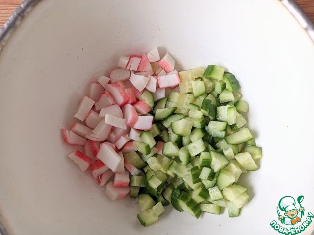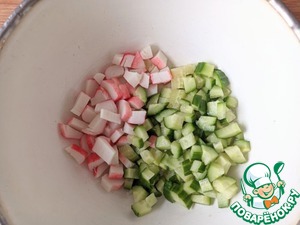 Слегка размороженные крабовые палочки режем кубиками. Огурец также кубиками.