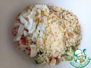 Добавляем порезанное яйцо, я использовала яйцерезку. Трём колбасный сыр на тёрку.