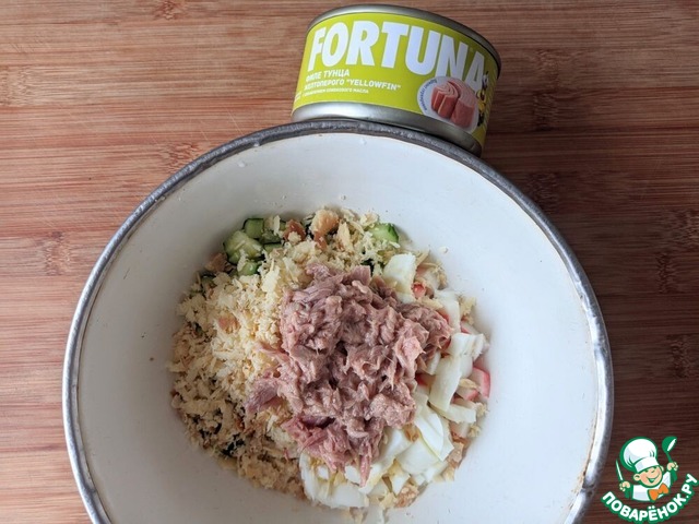 Тунец разминаем вилкой, добавляем в салат. Если тунец в масле, кладём немного и масла, тогда меньше будете добавлять майонеза. У меня тунец ТМ FORTUNA.