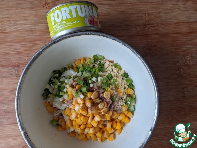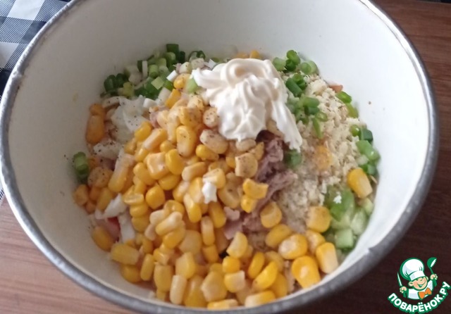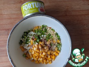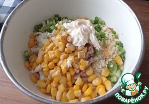 Добавляем кукурузу, порезанный колечками зелёный лук, соль, перец. Я не добавляла соль.
