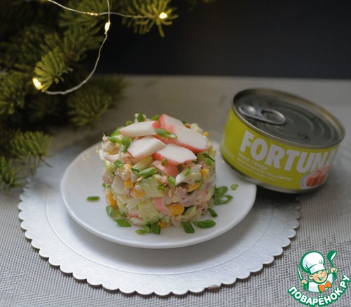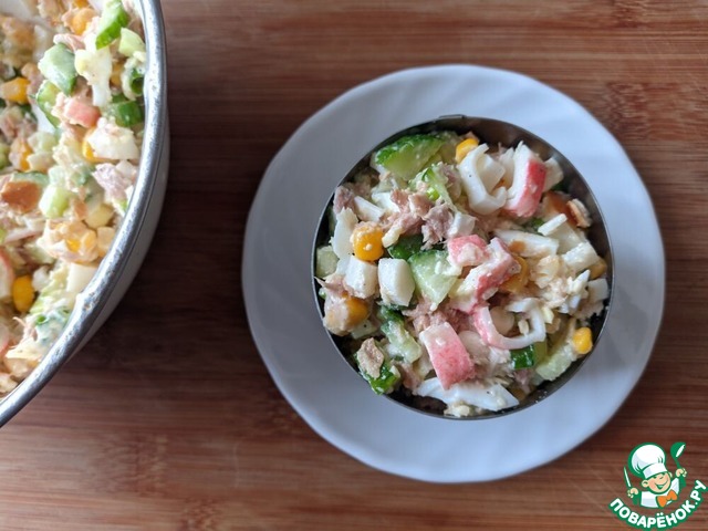 Рецепт из старой записной книжки. Ему около 30 лет. Тогда у нас на Дальнем Востоке активно на Новый год стали делать салаты из крабовых палочек и всячески экспериментировать с ними. Делали почему-то непременно с кукурузой, которая тоже только появилась на прилавках магазинов. Этот салат у нас делали с консервированной кетой. Я же решила сделать этот салат с тунцом. Название по имени автора рецепта.