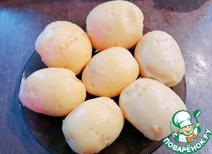 Картофель помыть, наколоть вилкой (чтобы не полопалась кожура) и отварить в подсоленной воде до готовности.