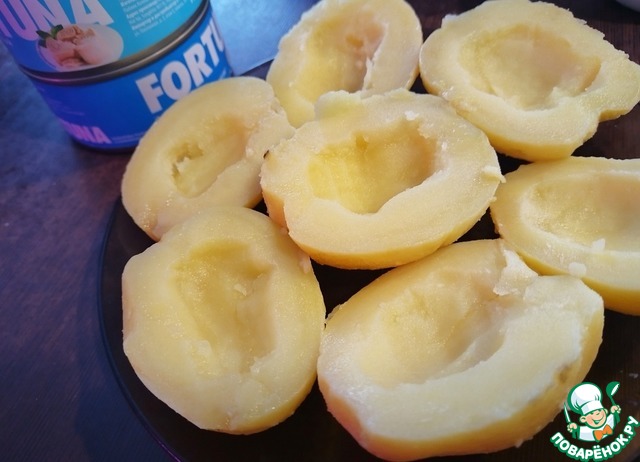 В полученную выемку положить консервированный тунец. С консервы предварительно слить воду. Важно, чтобы консервированный тунец был плотным. Я использую консервы ТМ FORTUNA. -