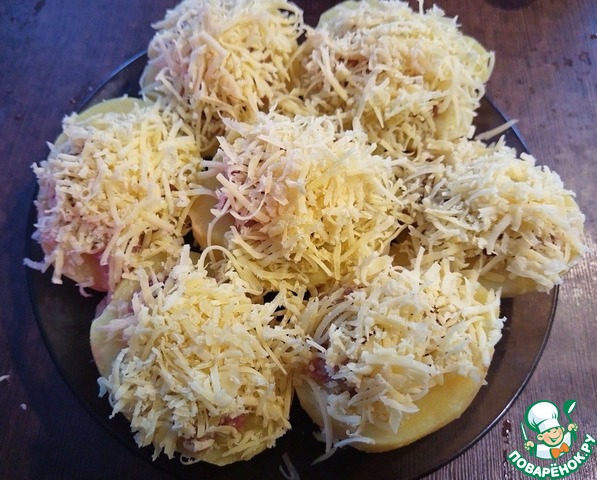 Сыр натереть на мелкой тёрке и "присыпать" сверху картофель.