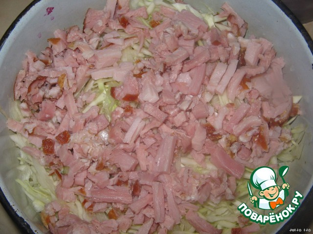 Нарезать соломкой карбонад или любое копчёное мясо.
