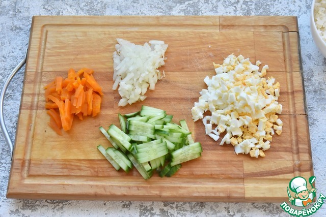 Заранее отвариваю рис в подсоленной воде до готовности и яйца.