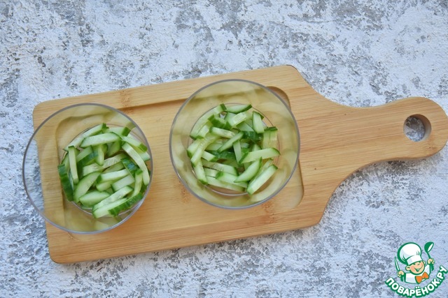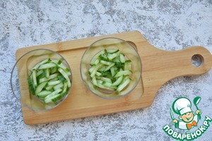 • В порционные бокалы укладываю огуречную соломку. Слегка придавливаю ко дну с помощью ложки.