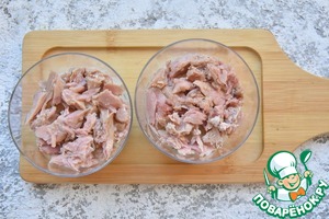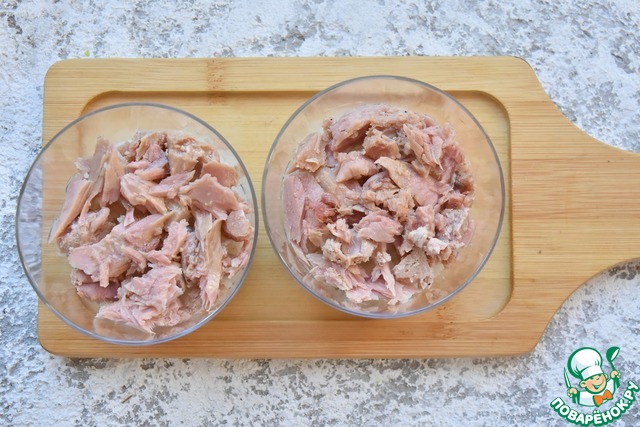 • Сверху на слой тунца распределяю тонким слоем лук.