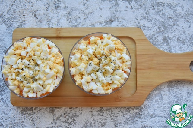 Готовлю продукты для приготовления салата. Данного количества продуктов достаточно для приготовления двух порций в порционных бокалах, объемом 150 мл.