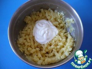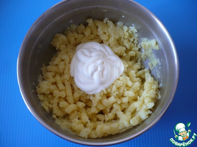 Отварите картофель, приготовьте пюре, добавьте щепотку соли, перемешайте и дайте остыть. Добавьте майонез в пюре только тогда, когда оно остынет. Все хорошо перемешайте.