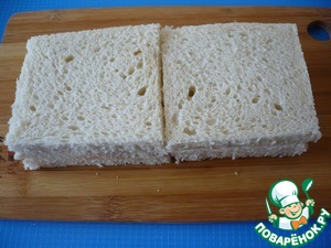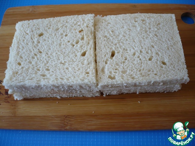 Острым ножом разрежьте хлеб с начинкой вдоль, получив несколько слоистых ломтиков толщиной ~ 1,5 см-2 см.