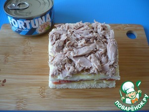 На картофельное пюре первым слоем выложите нарезанные кусочки форели. Затем накройте другим ломтиком хлеба, выложите снова слой картофеля и на него консервированного тунца.