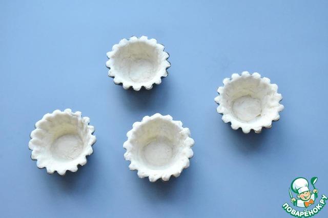 Заготовки из теста выкладываю в формочки и разравниваю его по дну и бокам. Излишки срезаю.