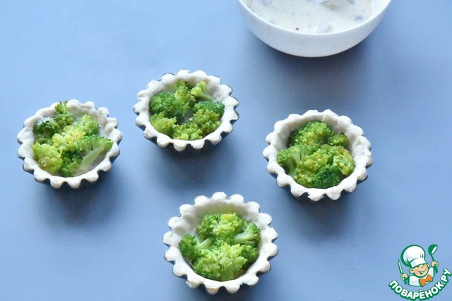 В формочки с тестом выкладываю часть заливки с тунцом. Распределяю соцветия брокколи и выкладываю оставшуюся сливочную заливку с кусочками тунца.