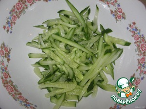Свежий огурец нарезаем соломкой.