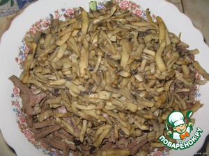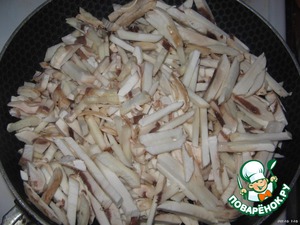 Шампиньоны нарезаем соломкой и обжариваем на почти сухой сковороде. Масла совсем чуть-чуть.